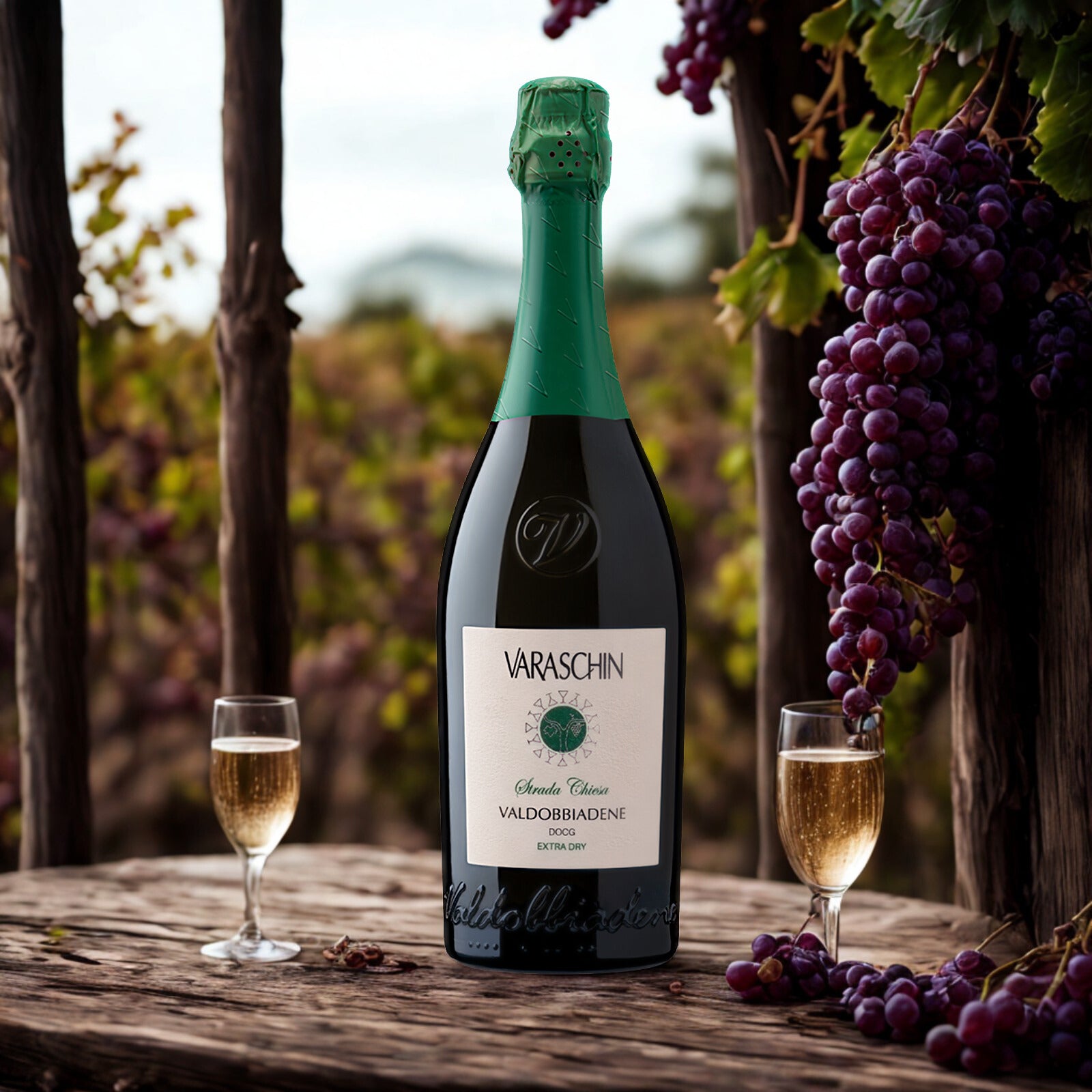 Strada Chiesa DOCG Extra Dry – Varaschin si presenta con un elegante giallo paglierino brillante, impreziosito da un perlage fine e persistente.