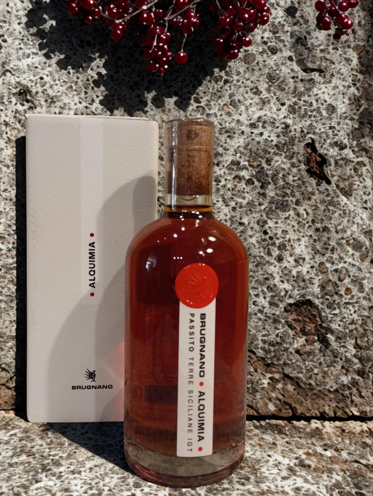 Alquimia – Brugnano è un vino dorato, luminoso e brillante che esprime tutta la luce e il calore della Sicilia. Al naso si apre con un profumo intenso e persistente, caratterizzato da note di albicocche e pesche sciroppate, fiori e miele di zagara, seguite da dolci sentori di datteri e fichi. Al palato è corposo, morbido e armonioso, con un perfetto equilibrio tra dolcezza e acidità che lo rende elegante e persistente. Un vino che racchiude la magia e la solarità della sua terra.