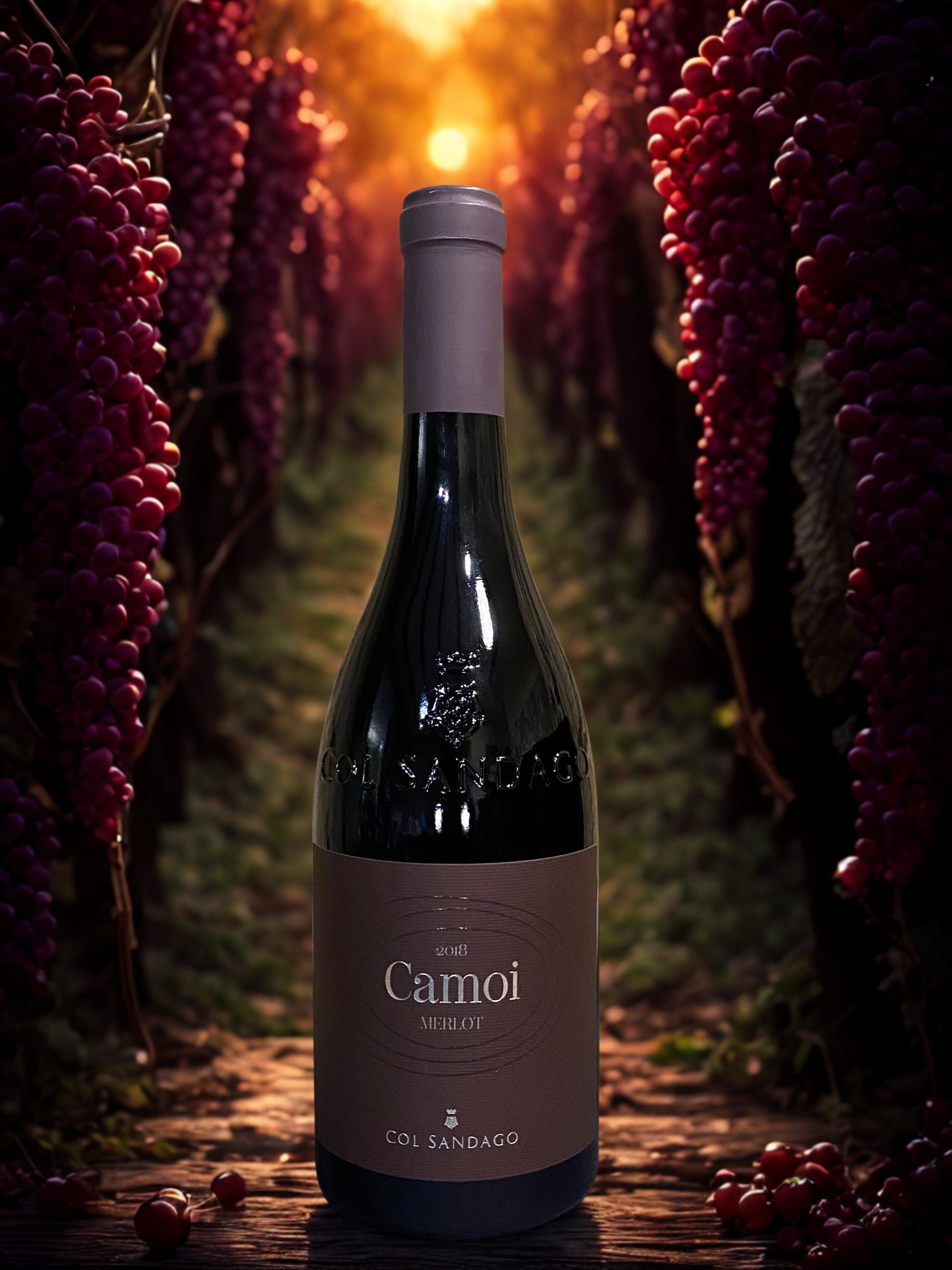 Merlot Camoi 2018-Col Sandago è un rosso rubino intenso dai profumi complessi di bacche nere, prugna, olive nere, tabacco e accenni vegetali. Al palato è deciso e sapido, con eleganti note di nocciola, fumo, erbe e cioccolato, tannini fini e lunga persistenza. Selezionato da Invictus per chi cerca un Merlot di grande carattere in formato Magnum, ideale per occasioni speciali.