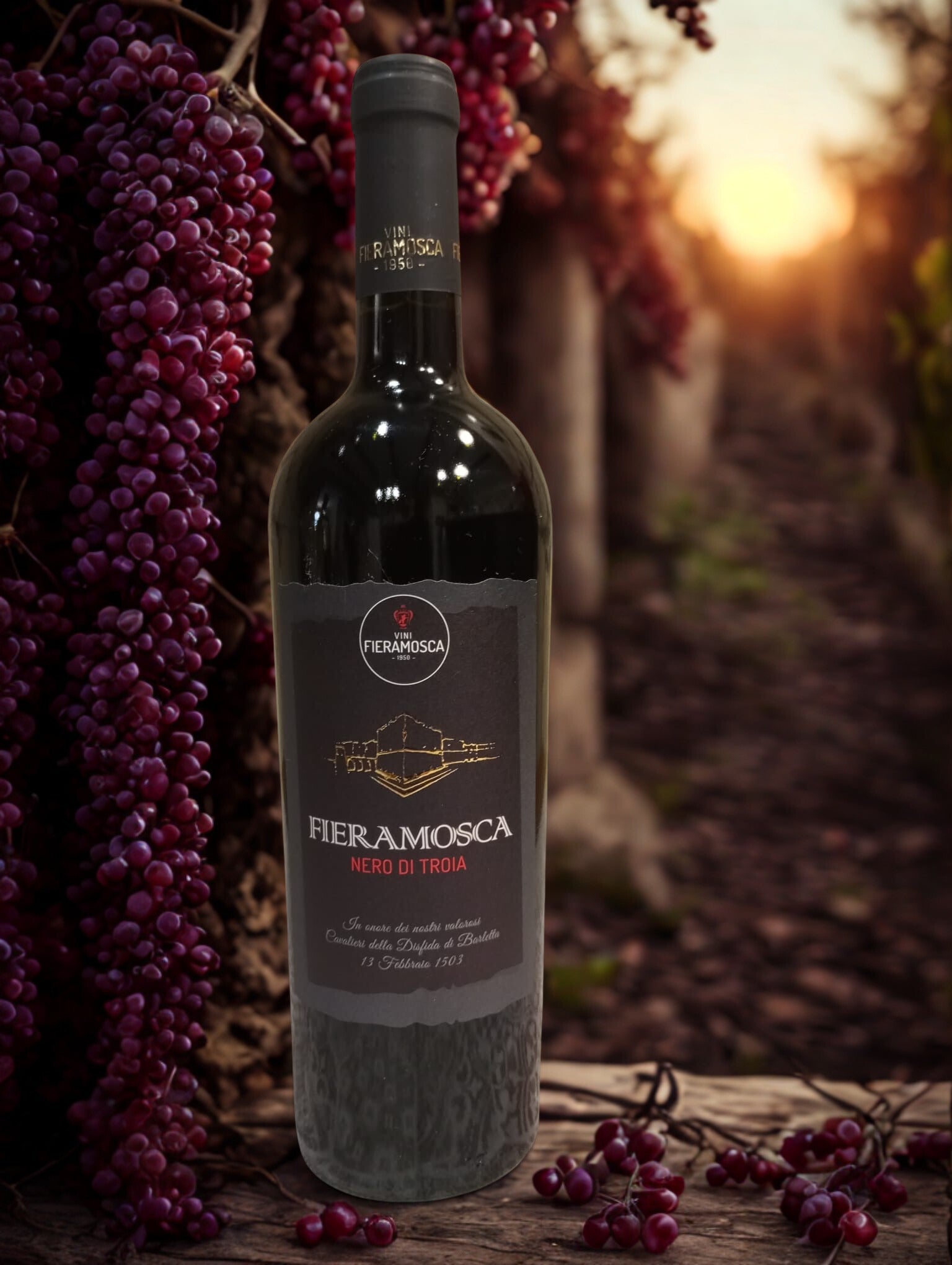 Nero di Troia – Fieramosca è un vino dal colore rosso rubino intenso con riflessi granato. Al naso esprime eleganti profumi di frutta rossa matura accompagnati da note floreali e sentori avvolgenti di vaniglia e tabacco. Al palato conferma le sensazioni olfattive, rivelandosi equilibrato, armonico e di ottima struttura, con un perfetto equilibrio tra tannini e acidità. Un vino raffinato e autentico che interpreta con eleganza la tradizione pugliese.